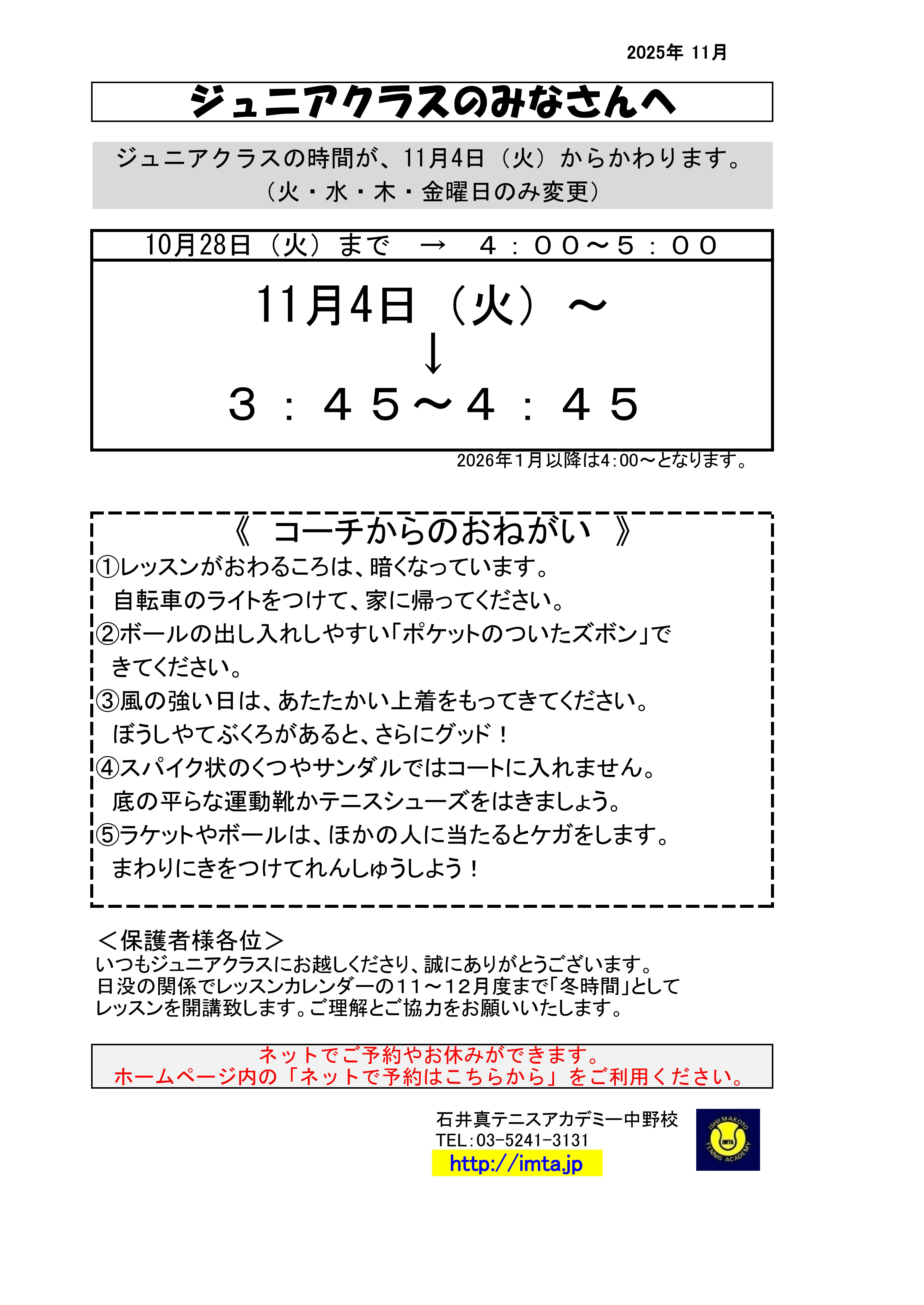 平日ジュニアクラス時間変更のお知らせ。