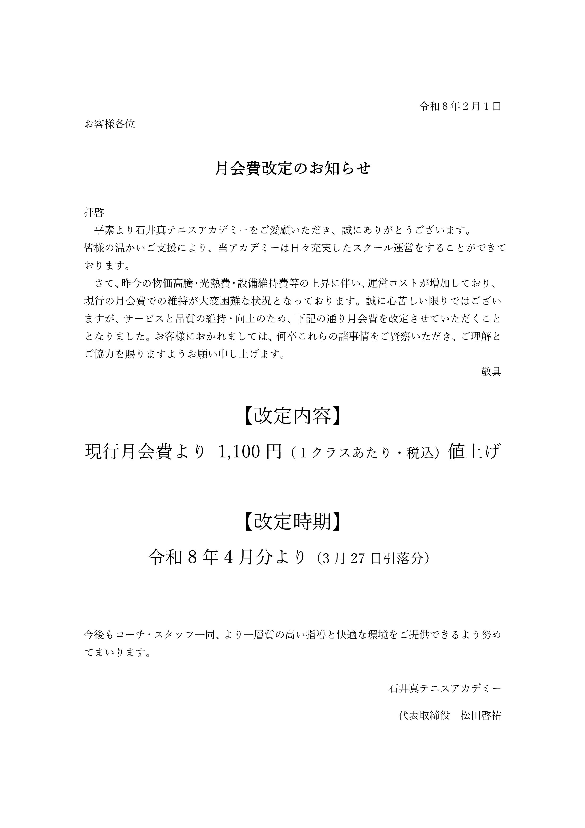 月会費改定のお知らせ
